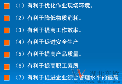 ①現(xiàn)場檢查。②區(qū)分必需品和非必需品。③清除非必需品。④處理非必需品。⑤每天循環(huán)整理。